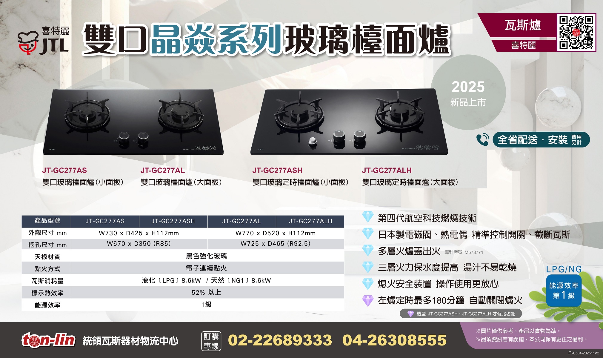 JT-GC277AL JT-GC277AL 雙口晶焱玻璃檯面爐(黑)_大面板