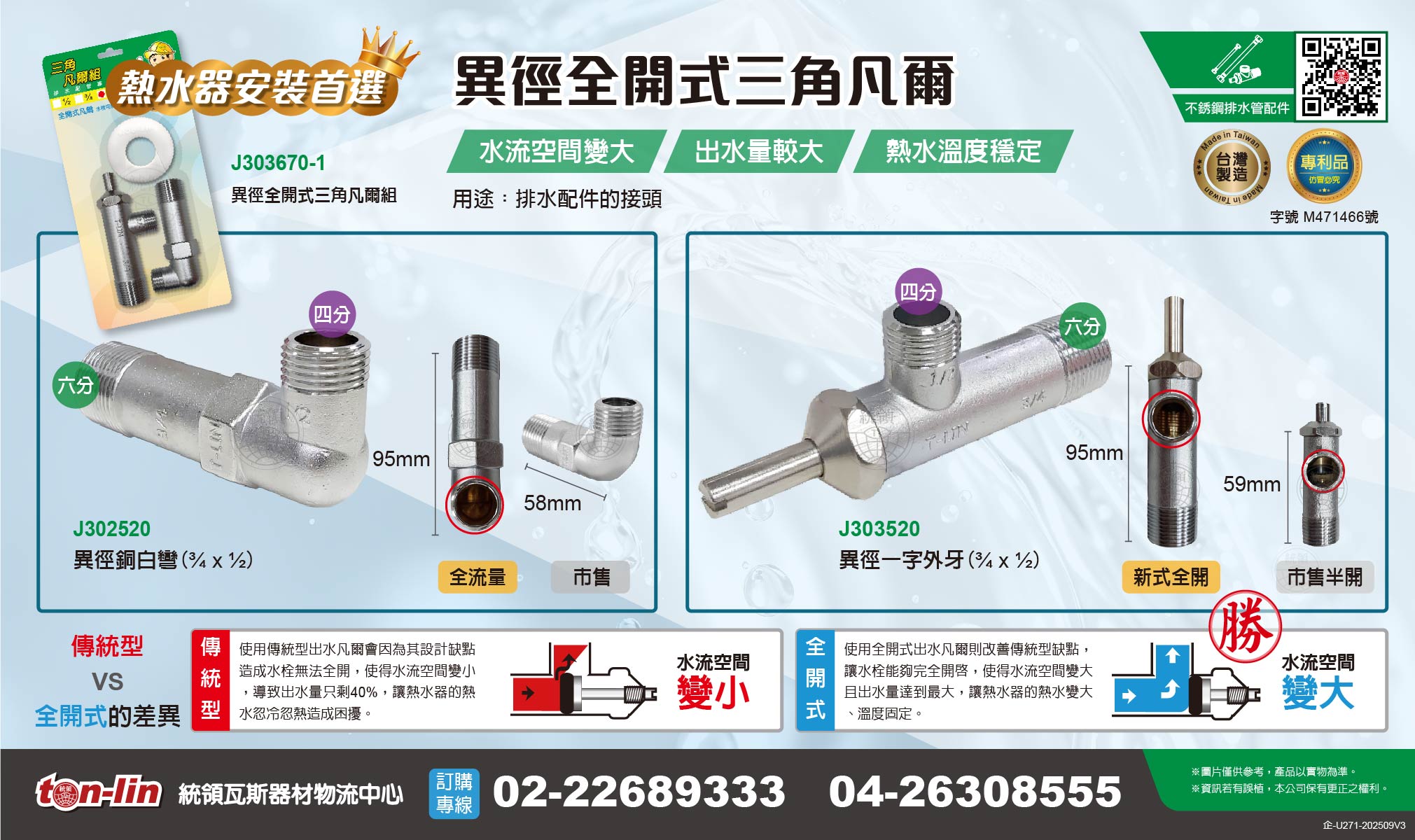 ●使用全開式凡爾可改善傳統型缺點,使得水流空間變大,且出水量達到最大,讓熱水器的熱水變大、溫度固定。